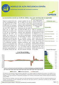 Mediante un modelo de alta frecuencia en los que se recoge la dinámica registrada en un conjunto amplio de indicadores de coyuntura económica, conseguimos estimar el crecimiento económico de España mes a mes. Se ofrece una proyección a futuro de este crecimiento mensual.