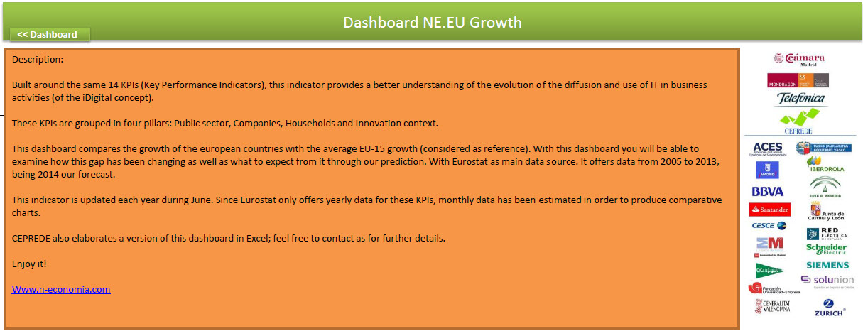This dashboard compares the growth of the european countries with the average EU-15 growth (considered as reference). With this dashboard you will be able to examine how this gap has been changing as well as what to expect from it through our prediction. With Eurostat as main data source. It offers data from 2005 to 2015, being 2016 our forecast.